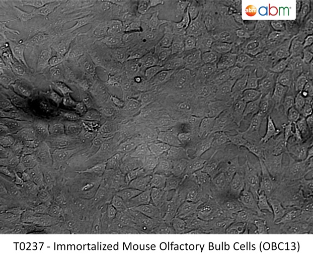 The olfactory bulb is located within the vertebrate forebrain, in which it functions to receive nerve endings/input from the nasal cavity. The sense of smell is associated with the nerve tissues of the olfactory bulb. Immortalized Mouse Olfactory Bulb Cells (OBC13) is immortalized with non-replicating retrovirus carrying the avian Myc gene. It is a sister derivative from the Immortalized Mouse Olfactory Bulb Cells (OBC1) (Cat. No. T0235). The cells exhibit GalC (a marker for oligodendroglial lineage) marker, but has the absence of NF (neurofilament marker). Voltage-dependent potassium channels are expressed as well. OBC13 cells have been shown to form tumors in animal models, hence has the ability to be tumorigenic. It is a valuable in vitro tool for studies relating to the functions and the biology of the olfactory bulb.The cells express resistance to 0.3 mg/ml G418 (Cat. No.G271). |